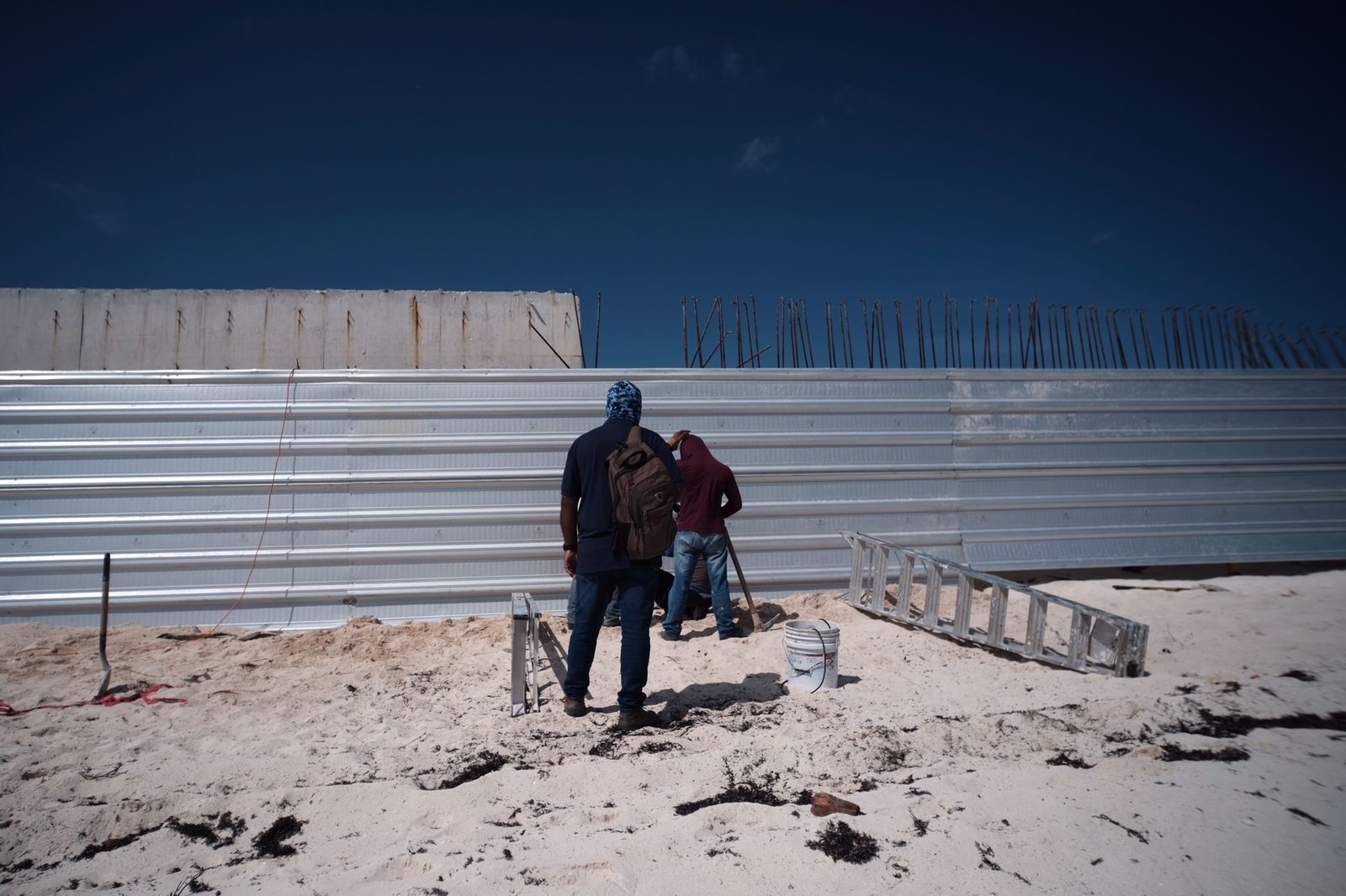 Cancún, Quintana Roo, 30 de octubre.- Trabajadores en la construcción del Hotel Grand Solaris, con ubicación en playa Delfines, fueron captados instalando un cerco metálico en el perímetro del terreno a unos metros del mar y también se puede observar enormes montañas de arena removida como resultado de la cimentación.