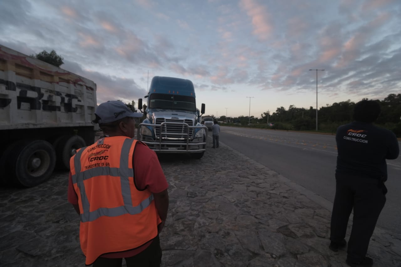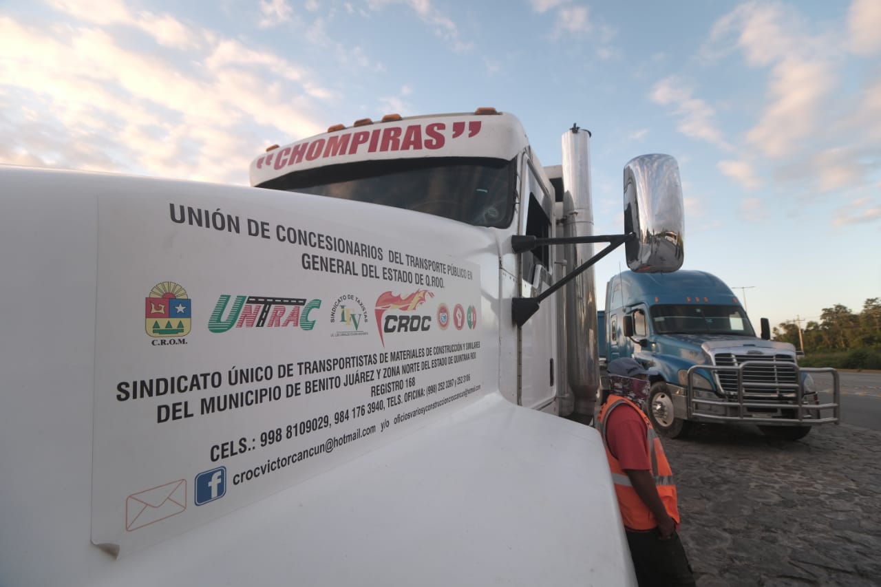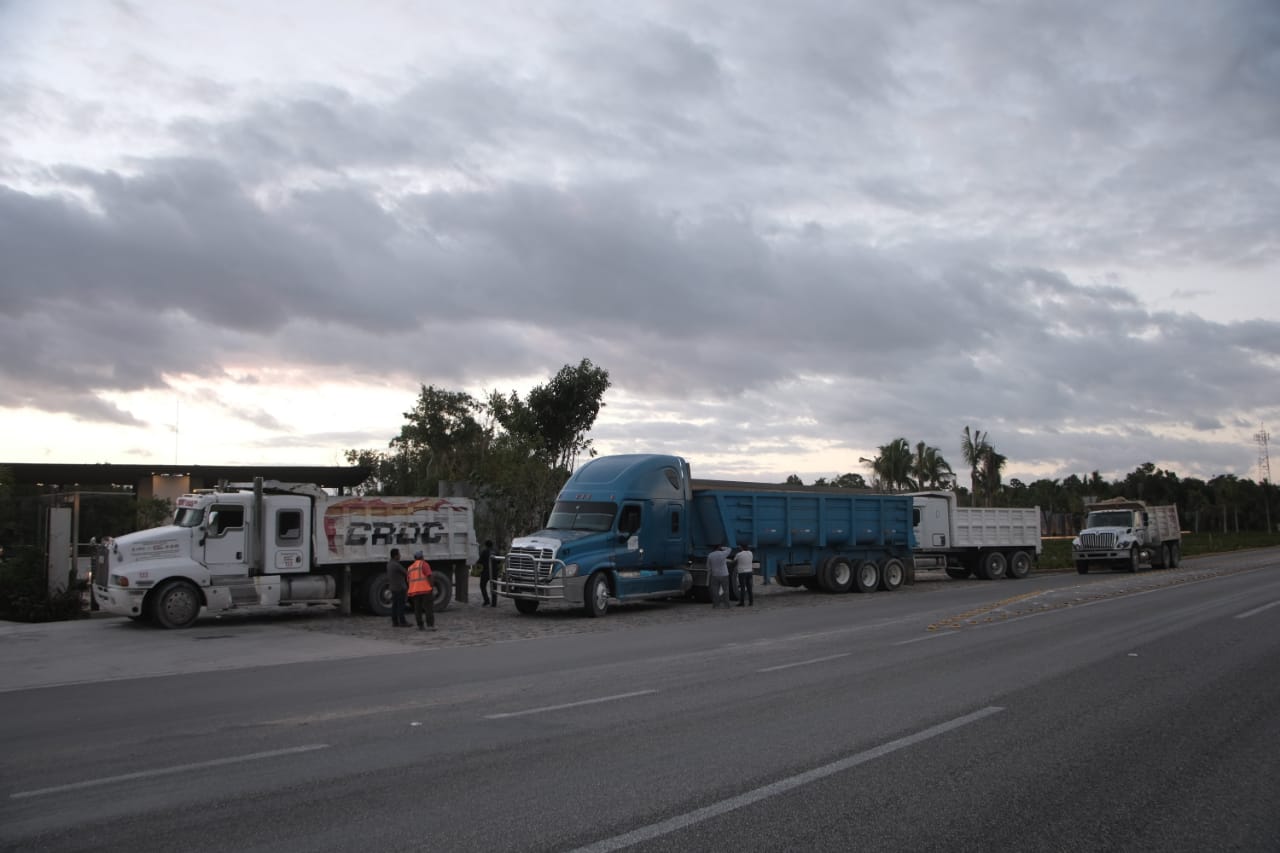 Cancún, Quintana Roo, 24 de noviembre.- Volqueteros de 10 sindicatos de la Unión de Concesionarios del Autotransporte Público en General del Estado de Quintana Roo se manifestaron esta mañana en la entrada del hotel AMAI, sobre la carretera Cancún-Puerto Morelos, en demanda de pago de servicios de transporte de materiales por más de un millón de pesos.