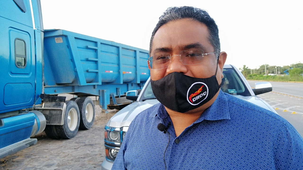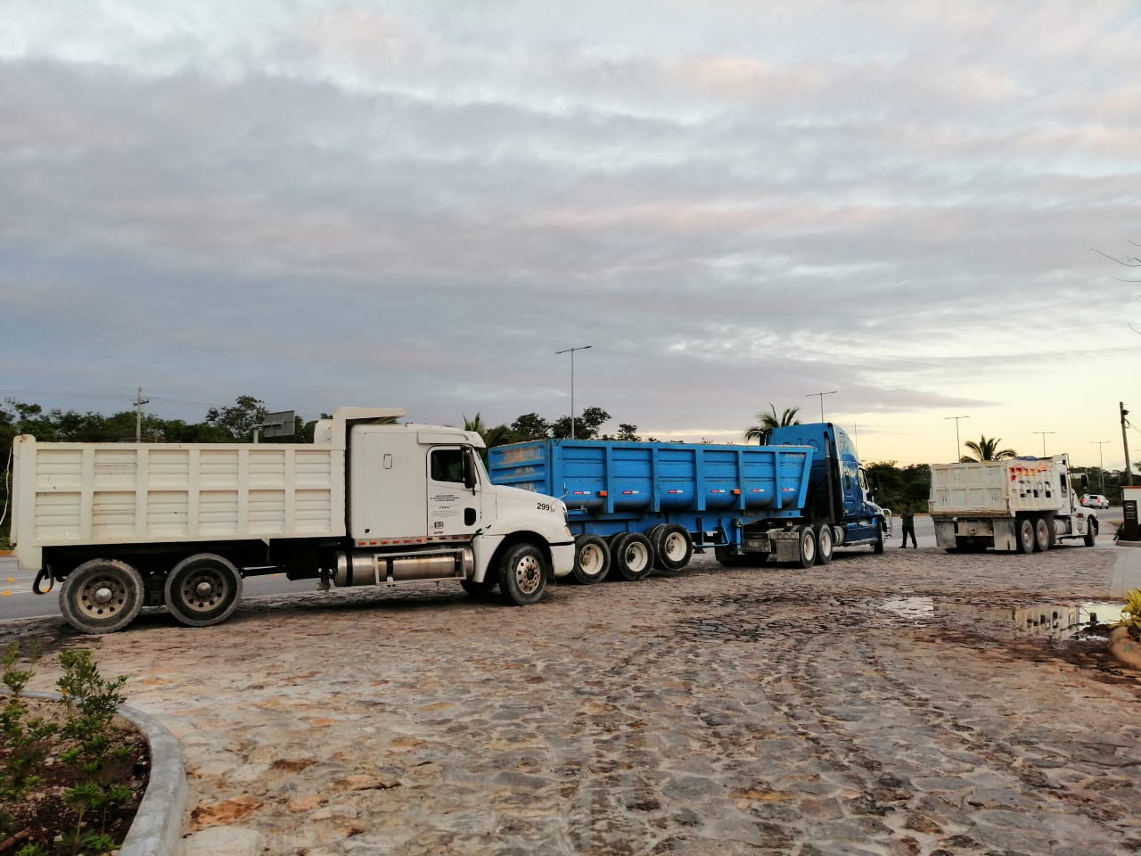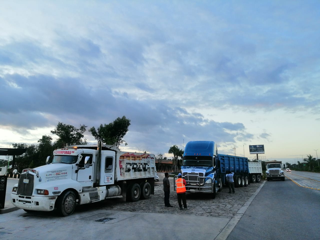 Cancún, Quintana Roo, 24 de noviembre.- Volqueteros de 10 sindicatos de la Unión de Concesionarios del Autotransporte Público en General del Estado de Quintana Roo se manifestaron esta mañana en la entrada del hotel AMAI, sobre la carretera Cancún-Puerto Morelos, en demanda de pago de servicios de transporte de materiales por más de un millón de pesos.